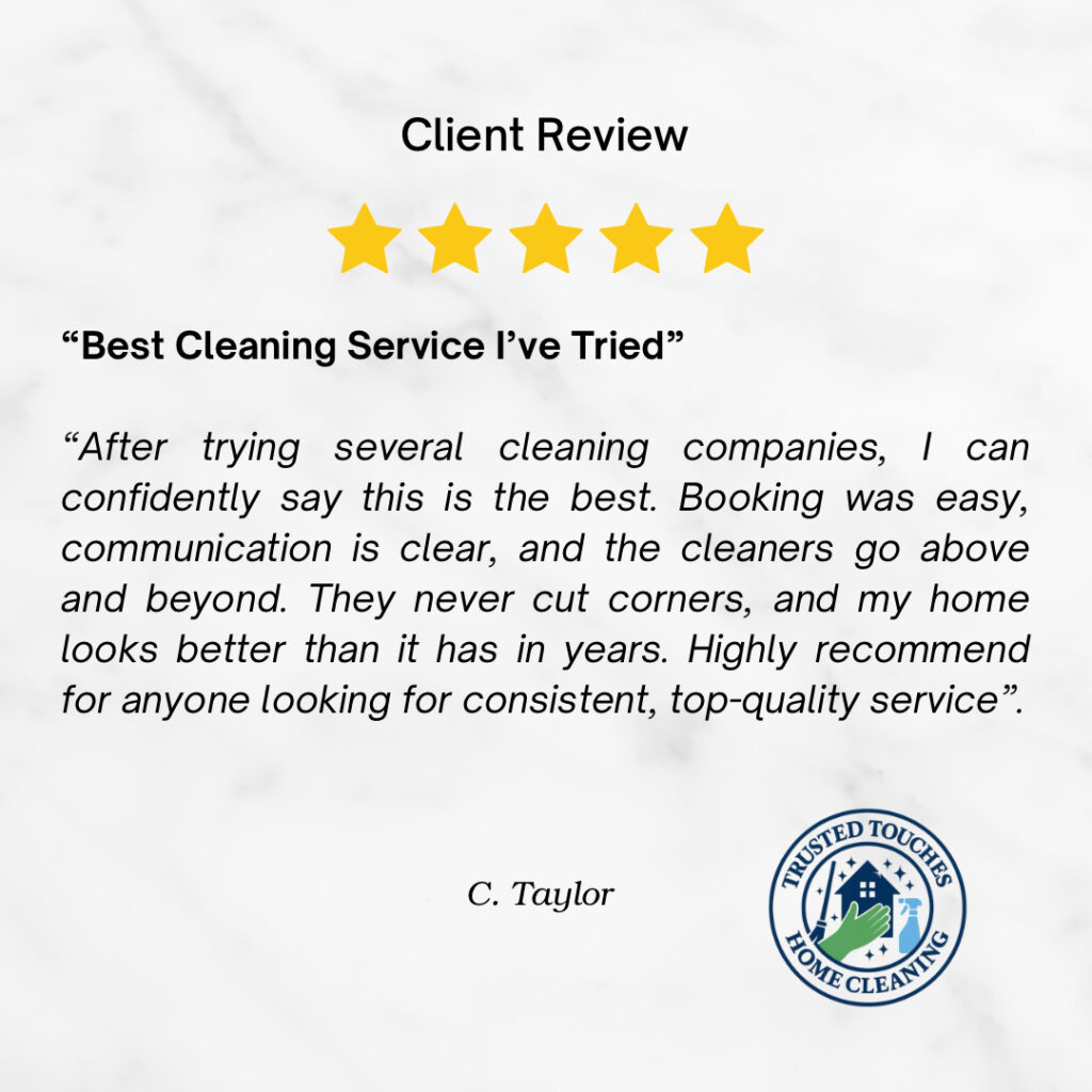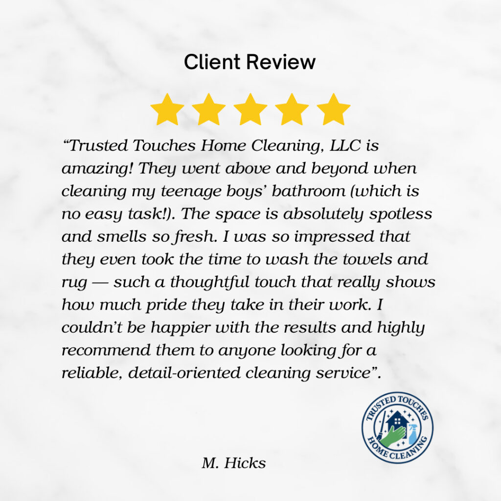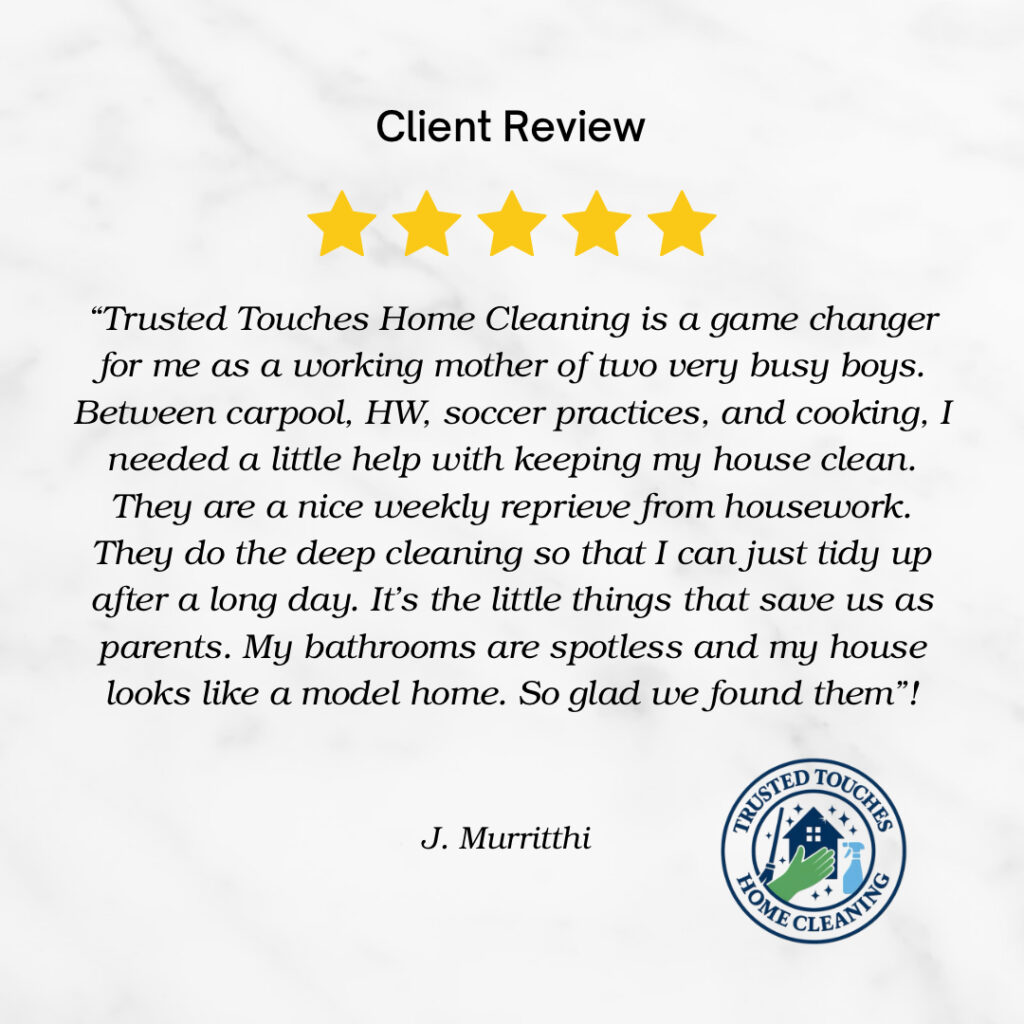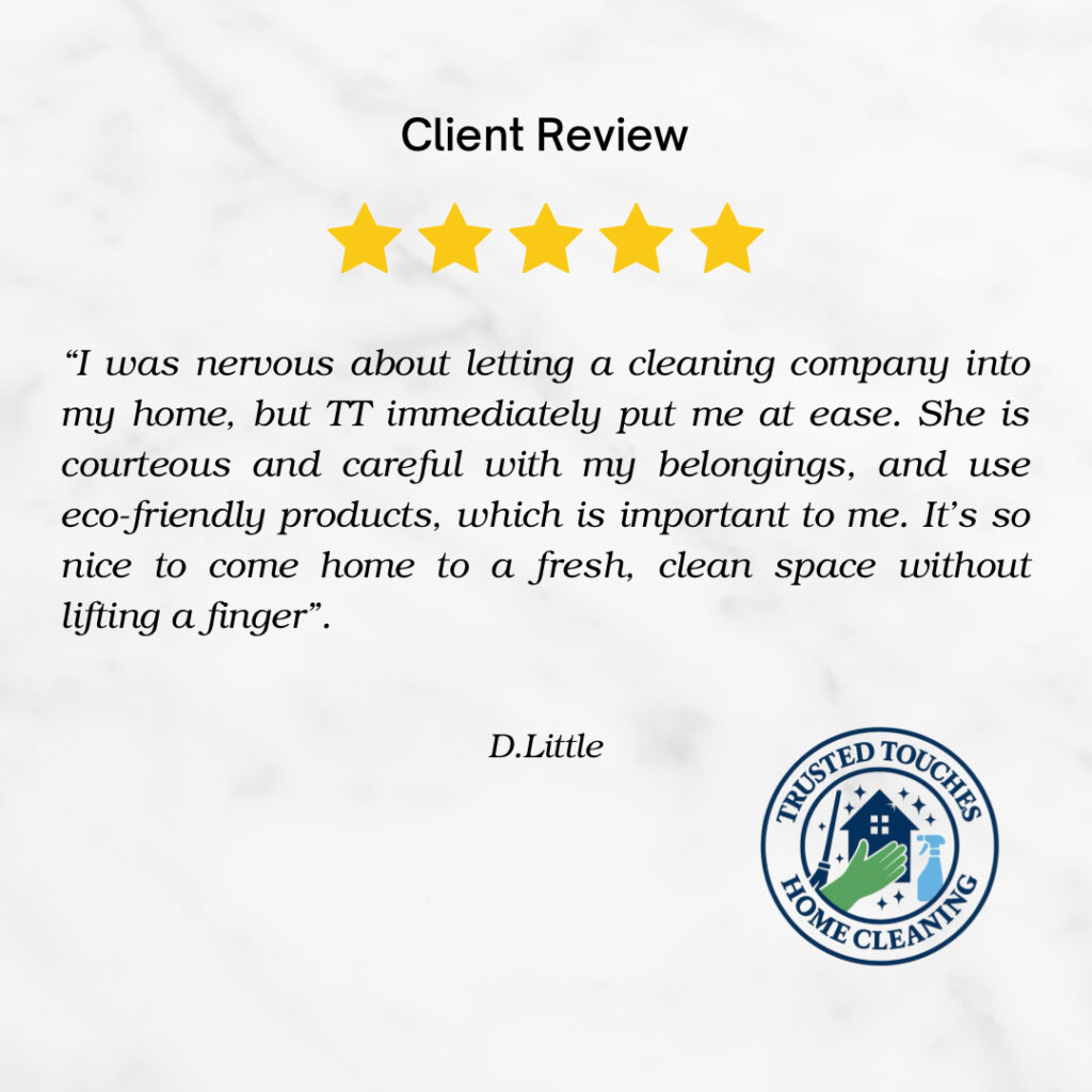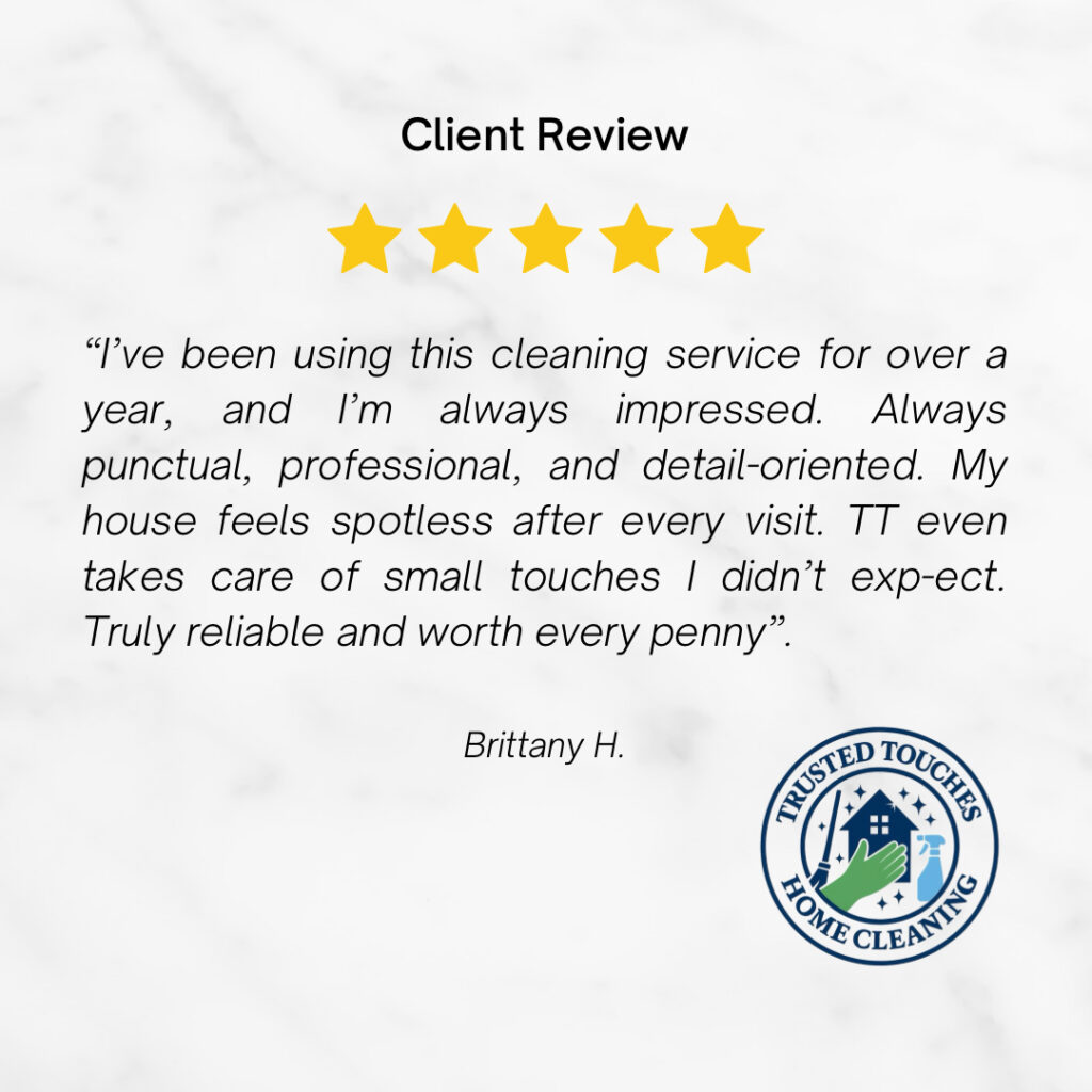 That passion led me to start Trusted Touches Home Cleaning. With each job, my goal is the same: give you back your most valuable resource — time. Whether it’s your home or your workplace, we deliver reliable, respectful service so you can focus on what matters most.